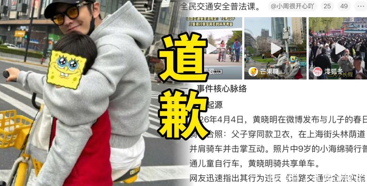4月5日,黄晓明发了条微博。没有红毯造型,没有新片宣传,而是一封手写道歉信:"今天我必须为自己的疏忽郑重道歉。"事情很简单:清明假期,他带9岁的儿子小海绵在上海街头骑行,拍了张父子击掌的合照发到微博。画面温馨,父子同款卫衣,一个骑共享单车,一个骑儿童自行车——谁能想到,评论区瞬间变成了普法现场。