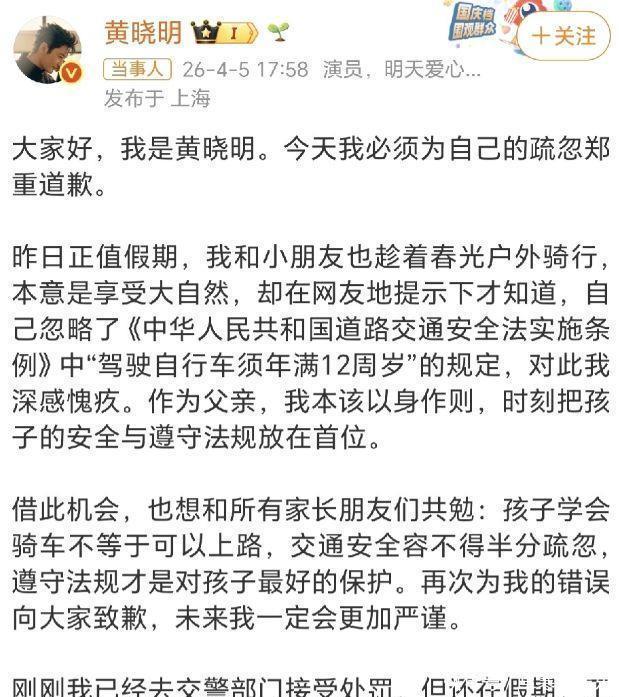 为什么是12岁?这不是拍脑袋定的数字。12岁以下的孩子,身体协调能力、应急反应能力、风险预判能力都还没发育成熟。遇到突发状况,很难做出正确判断。河北曾发生过一起悲剧:一个11岁男孩在道路上骑行时意外摔倒,被后方汽车碾压身亡。这条年龄红线,是用血泪教训换来的。三、黄晓明的"危机公关",能给多少分?说实话,黄晓明的处理方式,比很多明星强太多了。看看他做了什么:第一,删博不逃避。 很多明星遇到争议,第一反应是控评、删负面、装没看见。黄晓明删了原博,但没装死,第二天主动发道歉信。第二,道歉不甩锅。 他没说"不知者无罪",没辩解"是在安全区域",而是直接承认: "我疏忽了,我错了。"第三,主动接受处罚。 他不是嘴上说说,而是真的去了交警部门。虽然因为清明假期,手续要节后办,但态度已经摆在那了。这种处理方式,被网友评价为"公众人物犯错后的纠错范本"。当然,也有人质疑:"明星就该比普通人更守规矩""好爸爸人设翻车了"。但从结果看,黄晓明的道歉反而赢得了多数人的认可。四、这场风波,给所有家长上了一课说到底,这件事最大的价值,不是"黄晓明道歉"这个热搜,而是全民交通安全普法。过去几天,"12岁才能骑自行车上路""16岁才能骑电动车"这些知识点,被无数家长转发、讨论。有网友说:"感谢黄晓明用亲身经历普法,这比100条公益广告都管用。"对于公众人物来说,名气越大,责任越大。他们的行为自带"示范效应"——做对了,是榜样;做错了,影响也比普通人更大。黄晓明的晒娃初心没错,想记录父子温情时光,这很正常。但疏忽法规,确实不该。温情可以有,规矩不能破。孩子的安全,从来都不是小事。写在最后黄晓明在道歉信里说了一句话,值得所有家长记住:"孩子学会骑车不等于可以上路,交通安全容不得半分疏忽,遵守法规才是对孩子最好的保护。"带孩子骑车没问题,但请记住:年龄要够12岁地点要选对(封闭公园、专业骑行道)头盔一定要戴规则和爱,从来不是对立的。遵守规则,本身就是对孩子最大的爱。这条法规,你之前知道吗?欢迎评论区聊聊!
