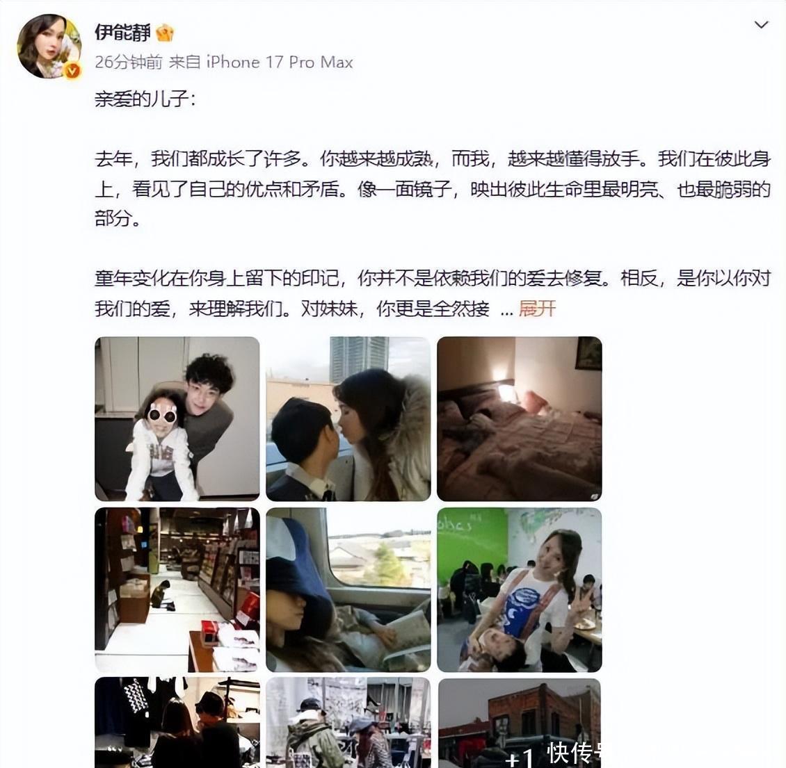 3月16日,演员伊能静晒出写给儿子恩利的长信祝其生日快乐,并晒出恩利每个时期的背影,满满都是爱。
